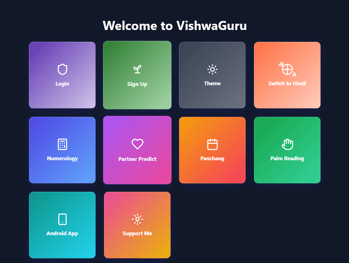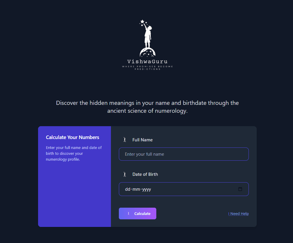 VishwaGuru is a modern numerology platform designed to simplify and personalize ancient insights using technology. The platform delivers accurate numerological analysis, personalized reports, and intuitive tools that help users understand patterns in their life, decisions, and future possibilities. Built with a focus on clean UI/UX and seamless performance, the product combines traditional numerology concepts with modern digital experiences. From generating detailed reports to providing interactive user journeys, the platform is designed to be both insightful and easy to use. The goal of VishwaGuru is to bridge the gap between ancient knowledge and modern users by creating a reliable, accessible, and engaging digital experience.